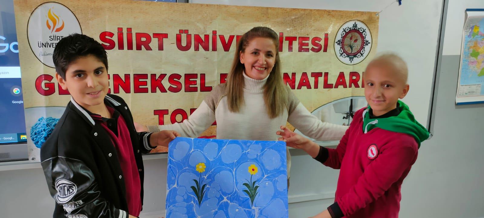 Üniversitemiz öğrenci topluluklarından Geleneksel El Sanatları Topluluğu, 12 Aralık 2025 Cuma günü Şehit Öğretmen Mehmet Kapusuz Ortaokulunda "Ebru Sanatı" etkinliği düzenledi. Etkinlik 2 saat sürdü ve etkinliğe 60 kişi katılım sağladı. Çocuklara Ebru Sanatı tanıtıldı, çocuklar birbirleriyle kaynaştı. Unutulmaya yüz tutmuş el sanatları ile ilgili bilgi verildi. Türk desenleri tanıtıldı, lale, papatya gibi çiçekler yapıldı.