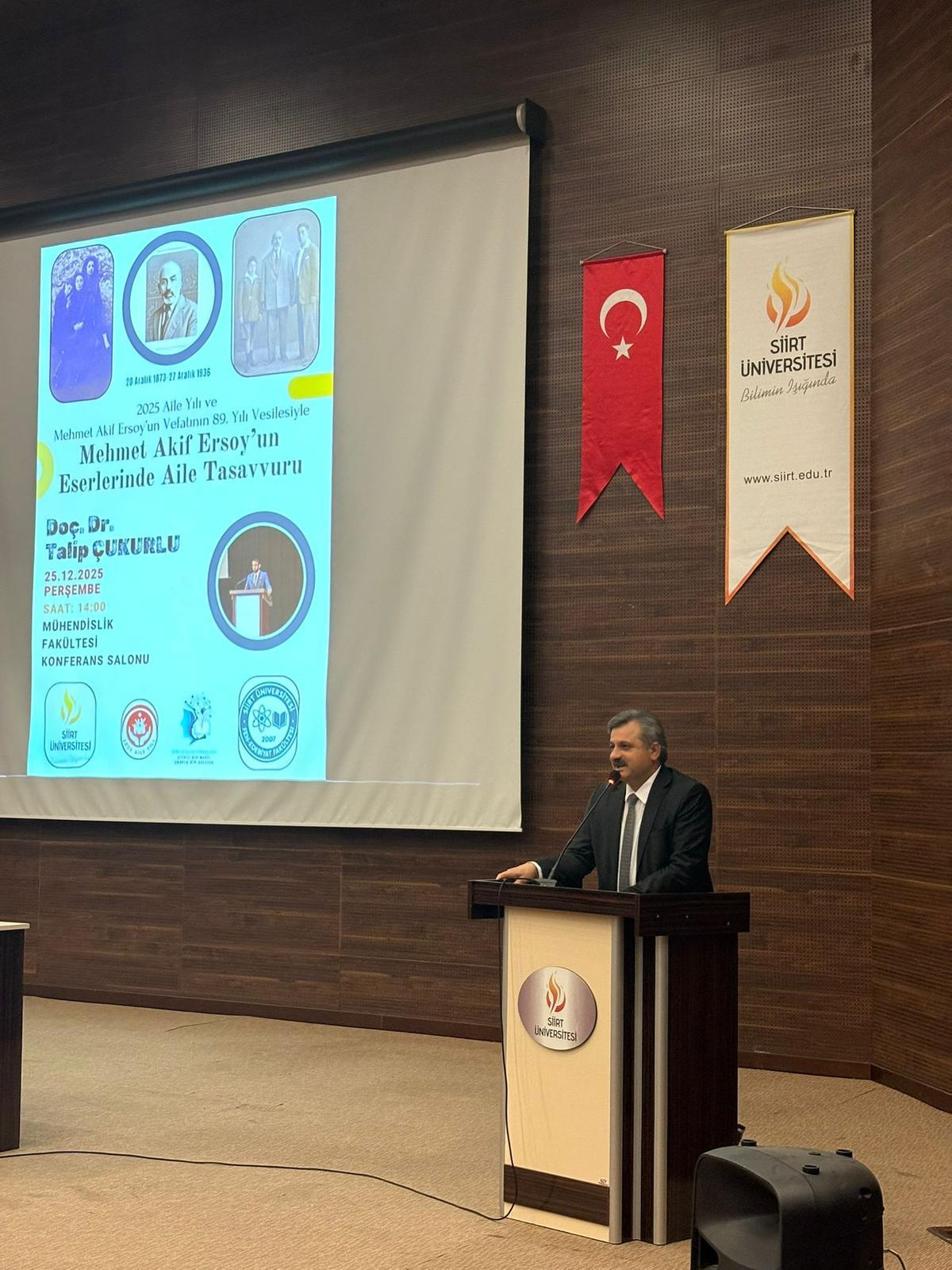 Üniversitemiz öğrenci topluluklarından Şiir ve Şuur Topluluğu, 25 Aralık 2025 Perşembe günü Mühendislik Fakültesi Konferans Salonunda "Mehmet Akif Ersoy'un Eserlerinde Aile Tasavvuru" etkinliğini düzenledi. Etkinlik 1 saat sürdü ve etkinliğine 350 kişi katıldı. Etkinlik kapsamında; Mehmet Akif ERSOY'un şiirleri ve eserlerinde aile kavramı öğrencilere bilgi verilmiştir.