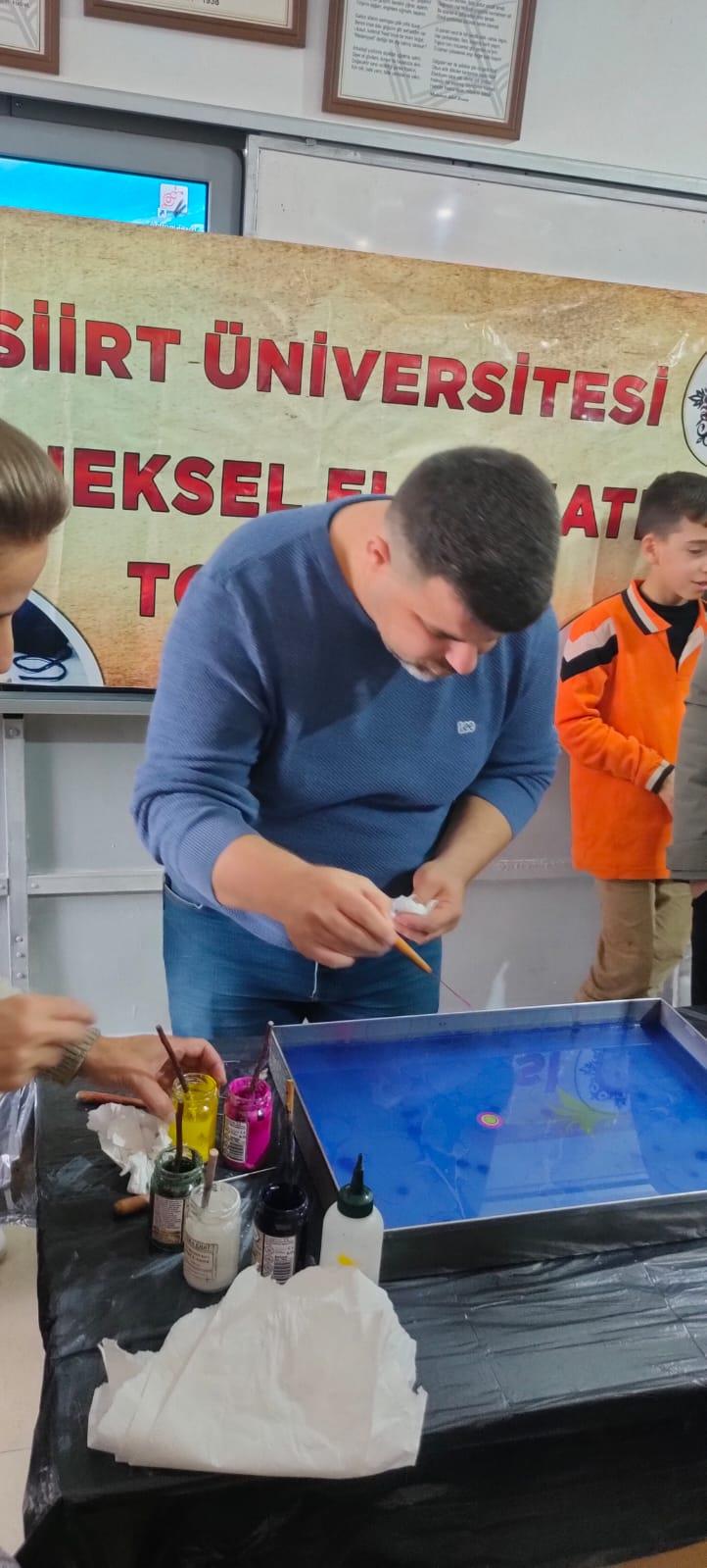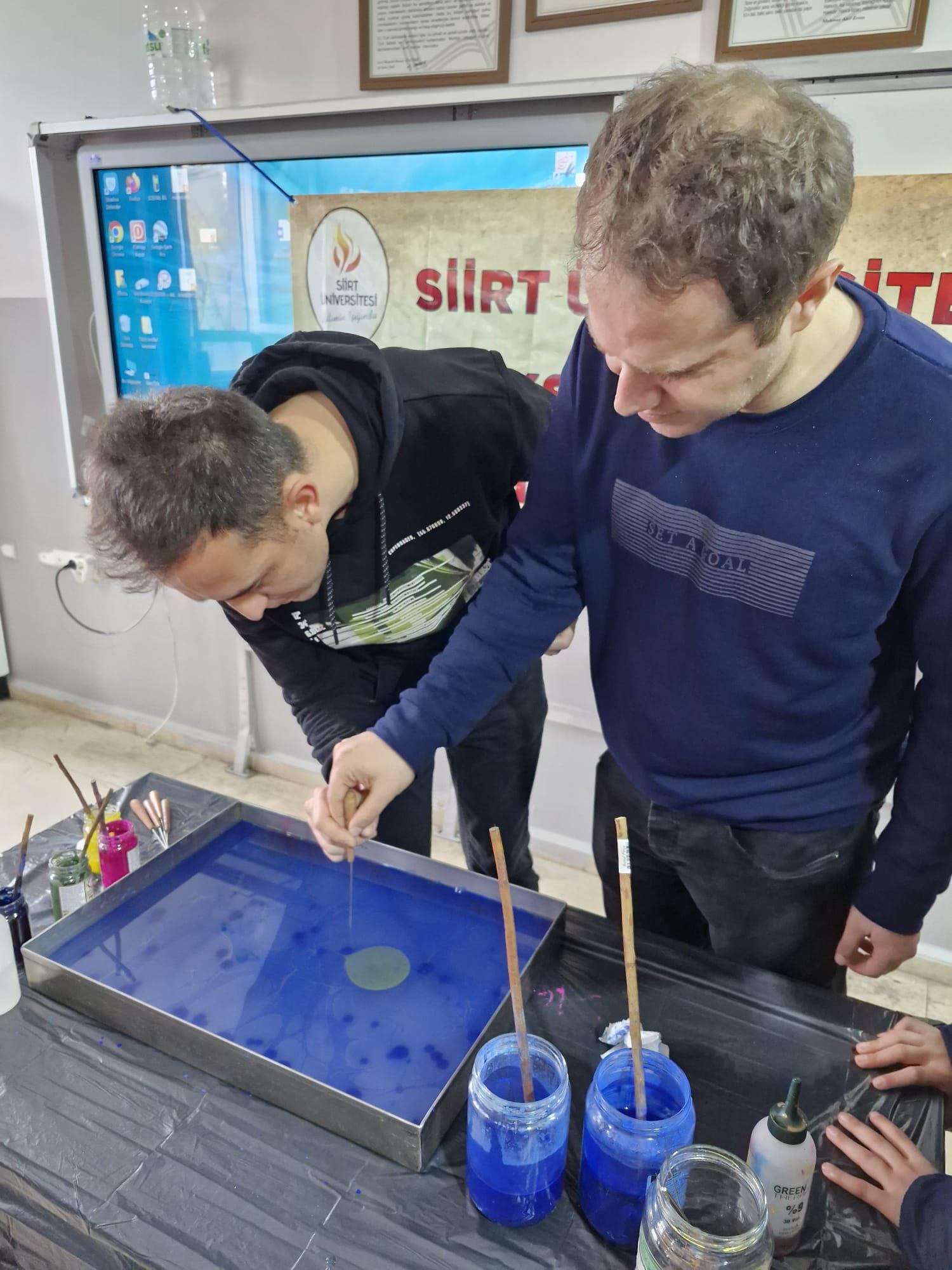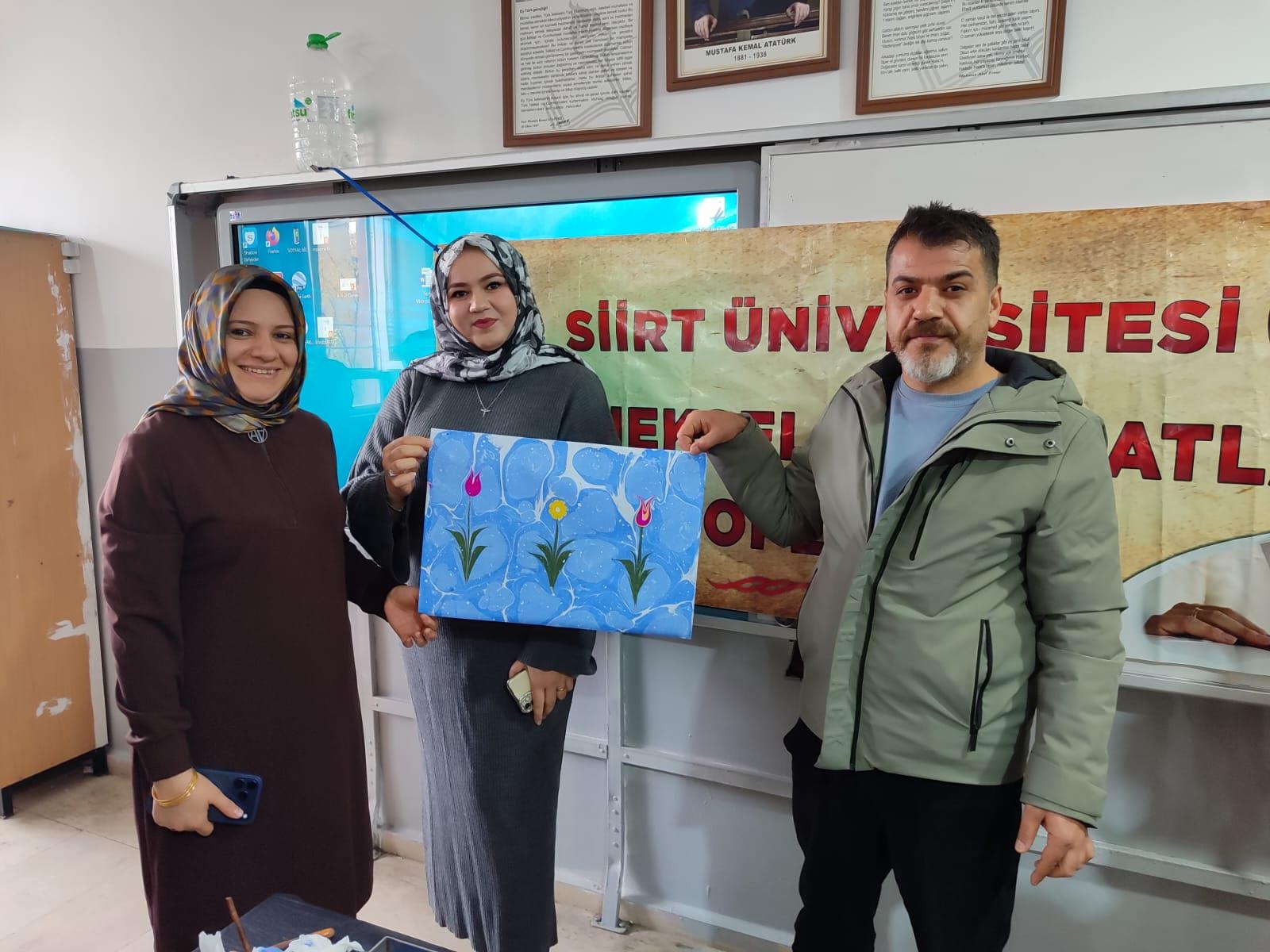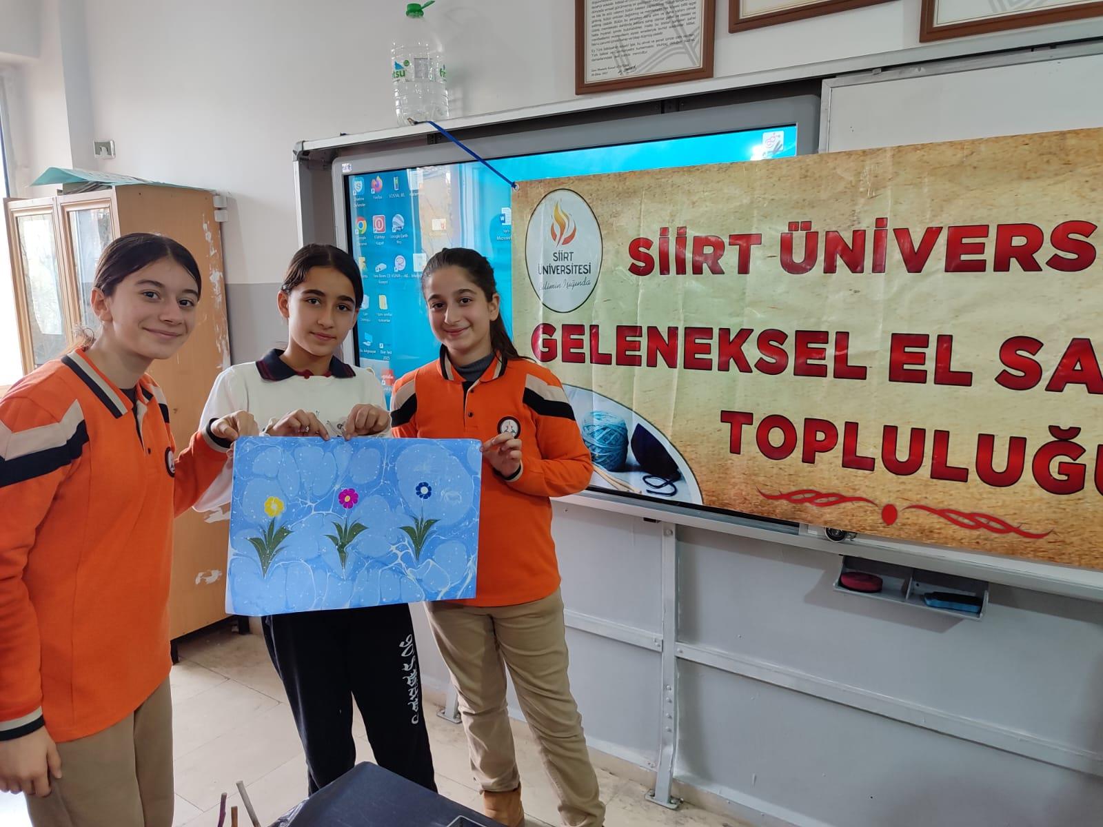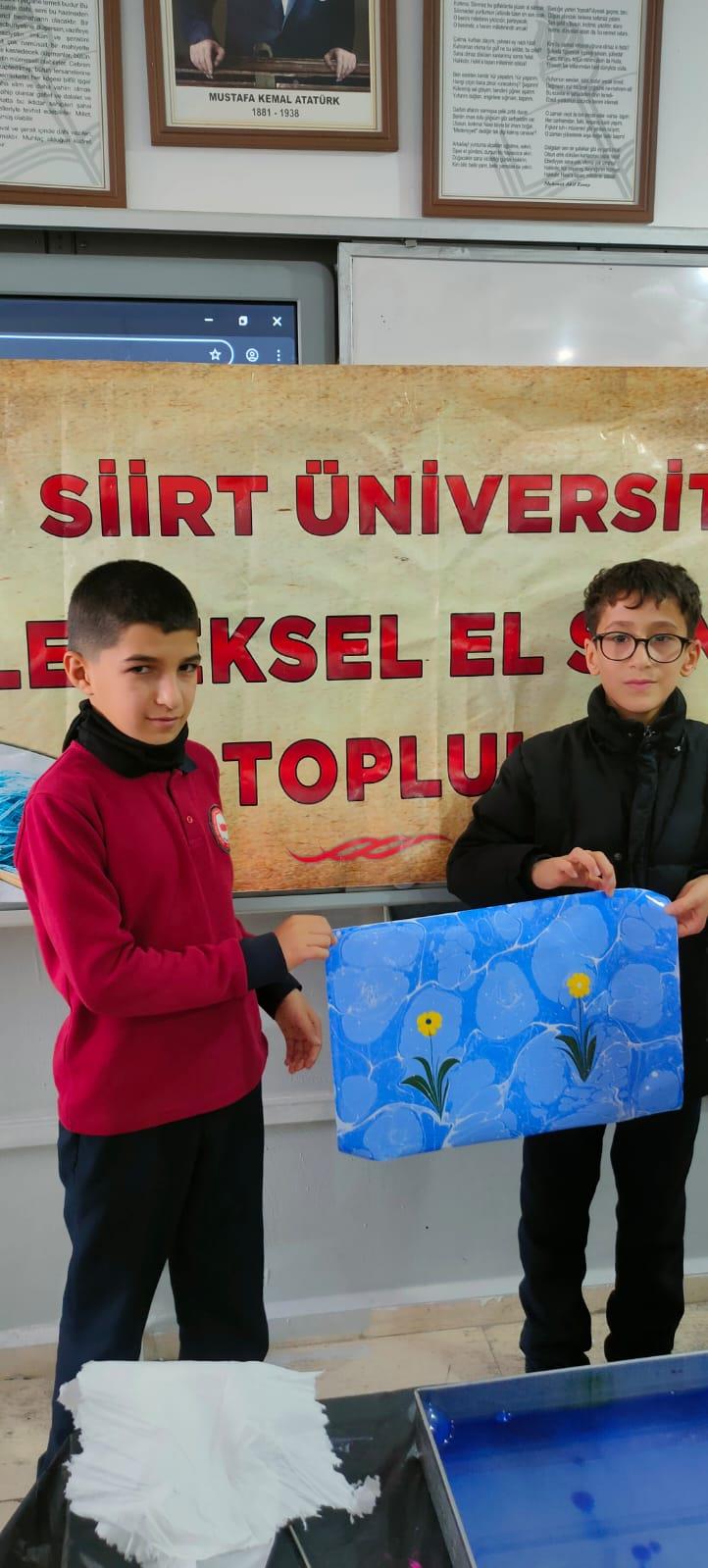 Üniversitemiz öğrenci topluluklarından Geleneksel El Sanatları Topluluğu, 12 Aralık 2025 Cuma günü Şehit Öğretmen Mehmet Kapusuz Ortaokulunda "Ebru Sanatı" etkinliği düzenledi. Etkinlik 2 saat sürdü ve etkinliğe 60 kişi katılım sağladı. Çocuklara Ebru Sanatı tanıtıldı, çocuklar birbirleriyle kaynaştı. Unutulmaya yüz tutmuş el sanatları ile ilgili bilgi verildi. Türk desenleri tanıtıldı, lale, papatya gibi çiçekler yapıldı.