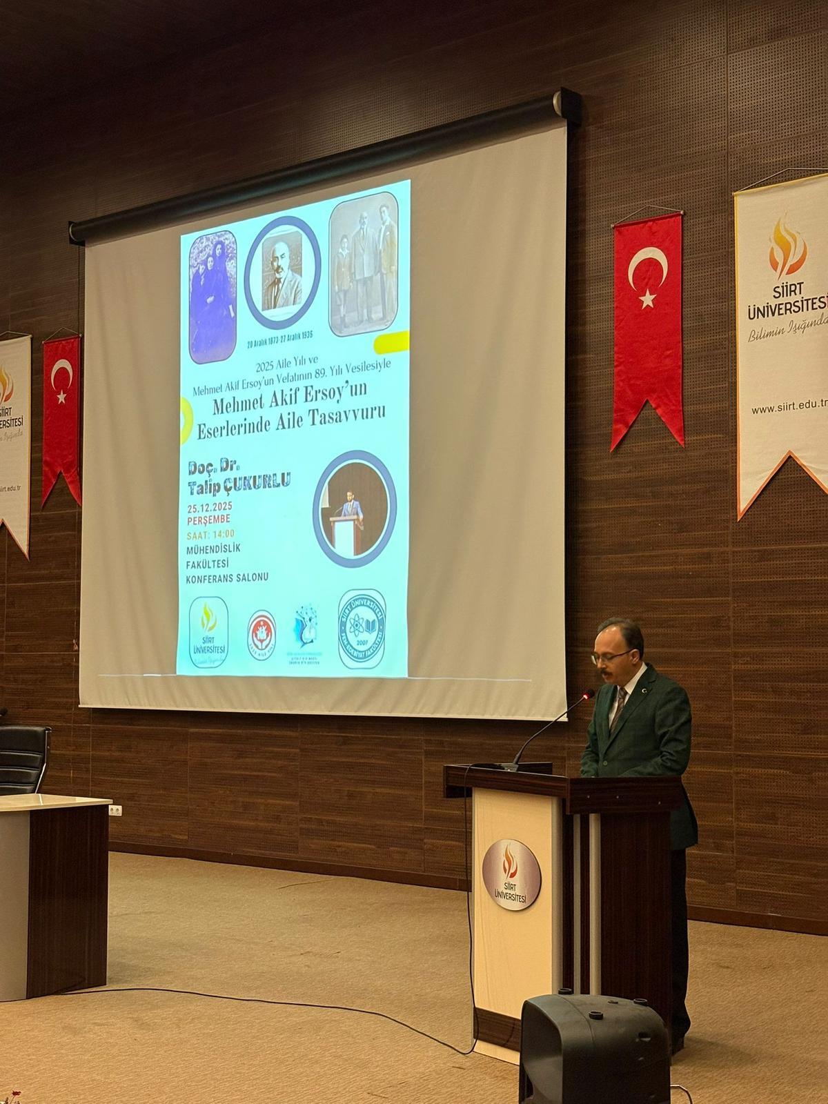 Üniversitemiz öğrenci topluluklarından Şiir ve Şuur Topluluğu, 25 Aralık 2025 Perşembe günü Mühendislik Fakültesi Konferans Salonunda "Mehmet Akif Ersoy'un Eserlerinde Aile Tasavvuru" etkinliğini düzenledi. Etkinlik 1 saat sürdü ve etkinliğine 350 kişi katıldı. Etkinlik kapsamında; Mehmet Akif ERSOY'un şiirleri ve eserlerinde aile kavramı öğrencilere bilgi verilmiştir.