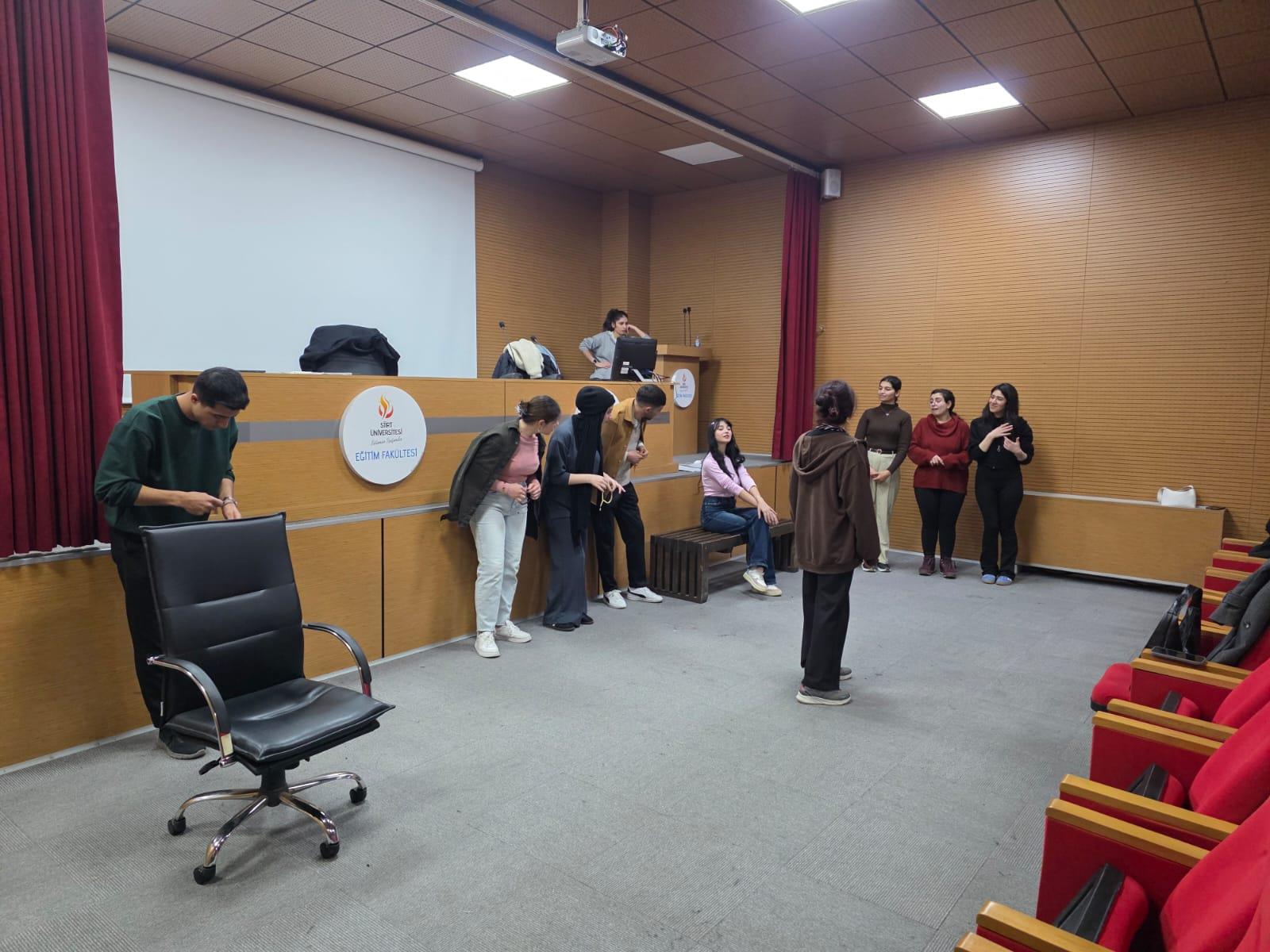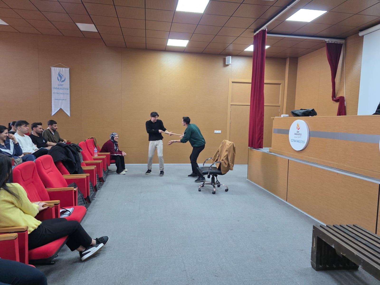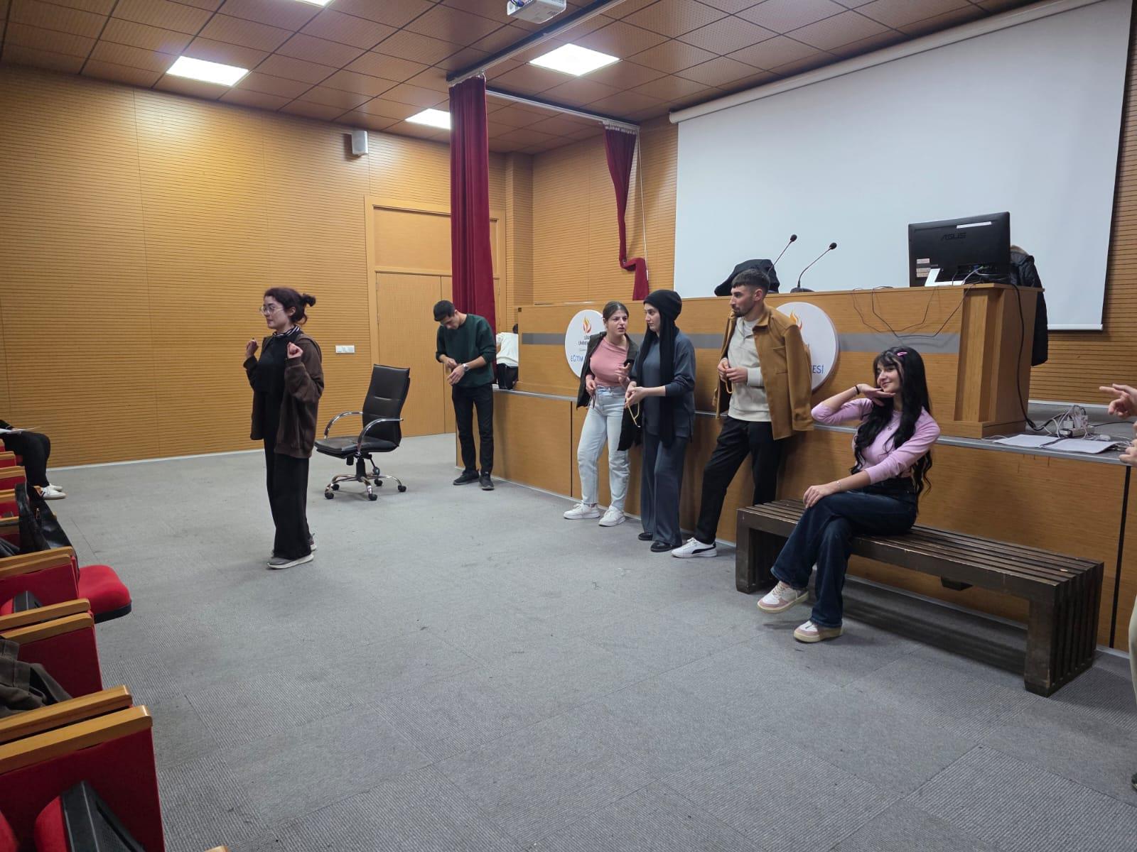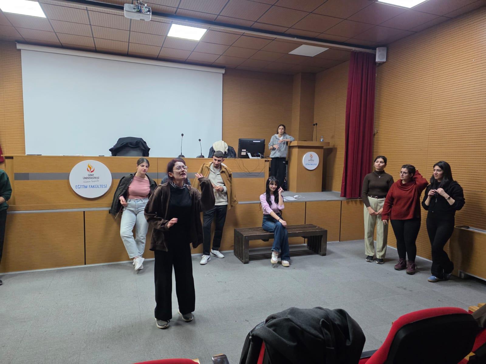 Tiyatro temelli etkinlikler kapsamında düzenlenen eğitim, saat 15.00–17.00 arasında iki saat sürdü ve üniversite içinden 25 öğrencinin katılımıyla tamamlandı.